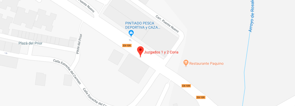 La oficina del Registro Civil de Coria de Cáceres se encuentra en Puente Nuevo, 12, en la esquina con la calle Estrecha del Carmen.